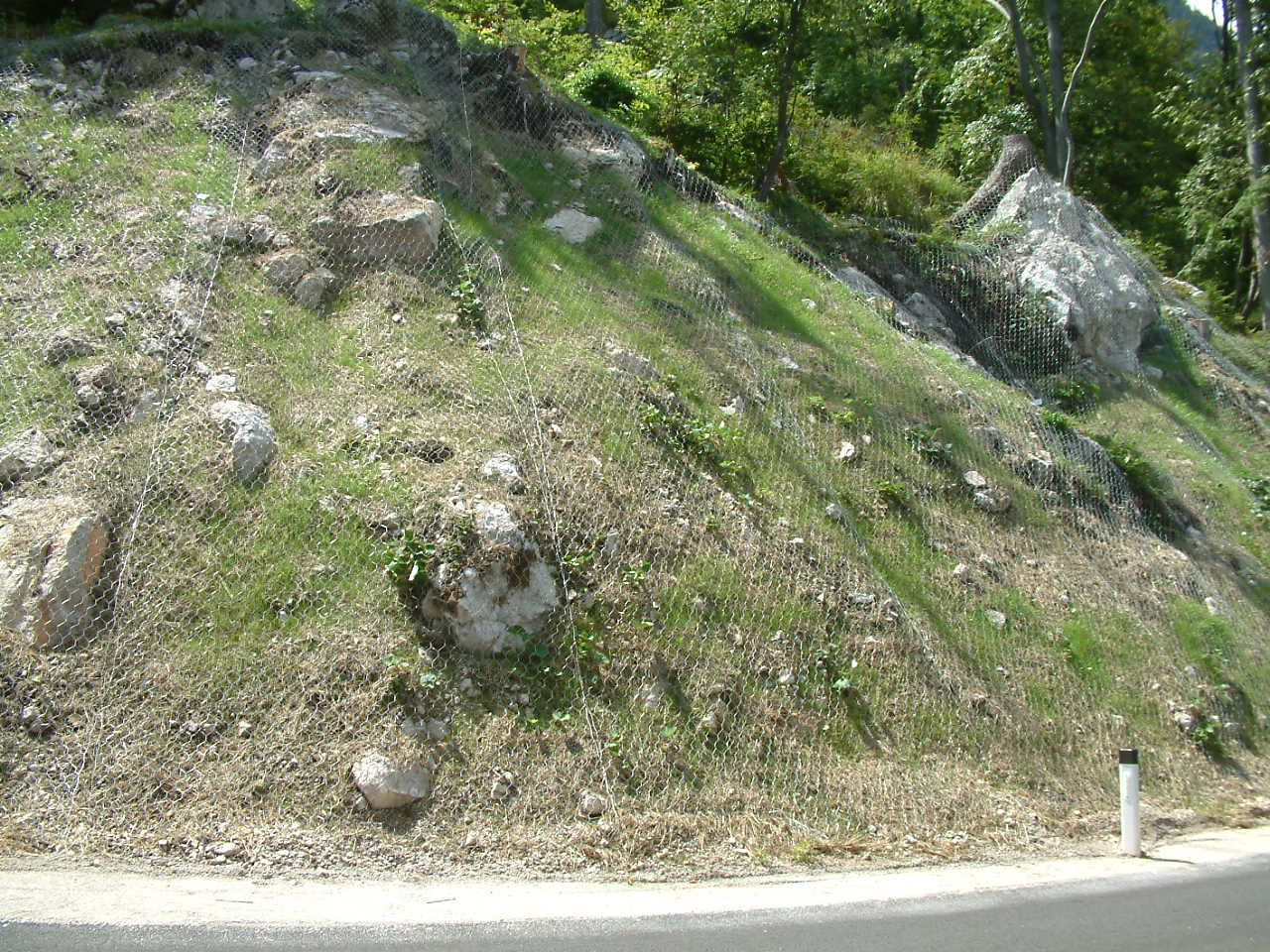 Težka sidrana mreža pomeni, da je brežina zaščitena z mrežo, le ta pa je sidrana na vseh mestih po potrebi. Na tej brežini smo prišli do spoznanja, da je na vsake 4 kvadratne metre 1 klin premalo.